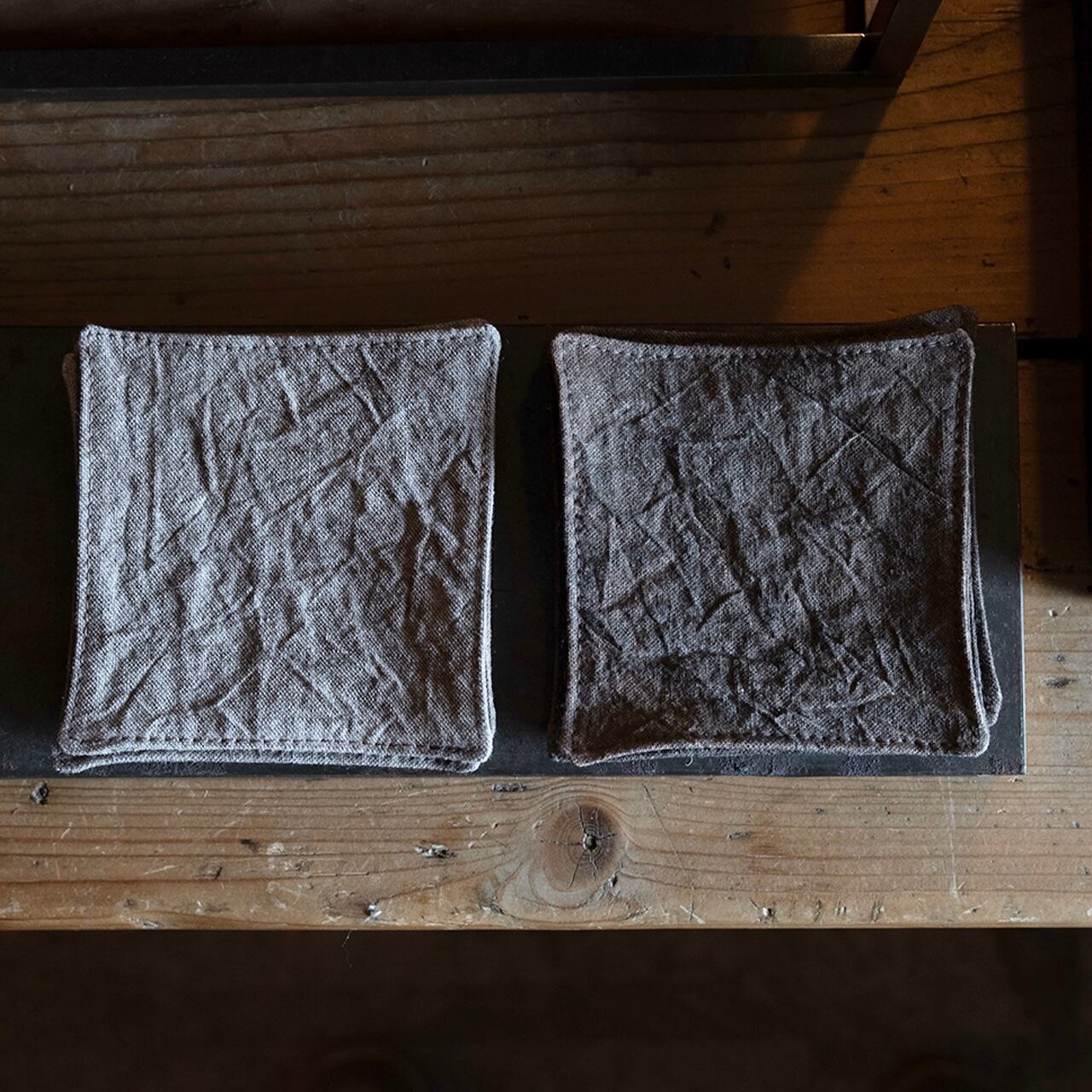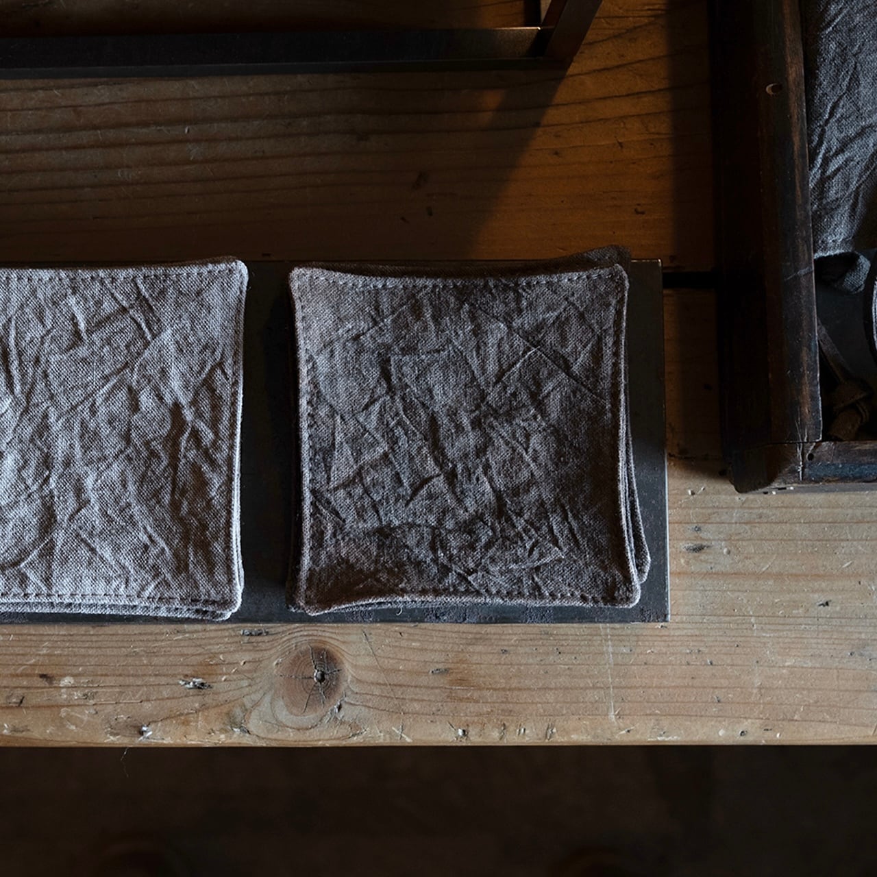 シワ感のある生地に鉄錆と柿渋で染めたコースターです。