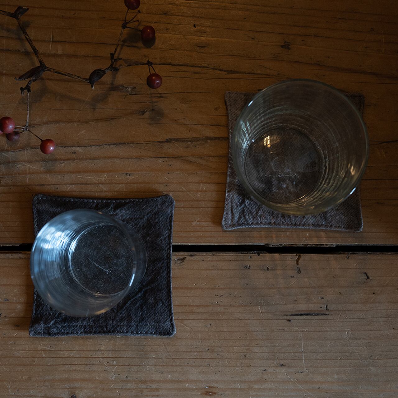 シワ感のある生地に鉄錆と柿渋で染めたコースターです。