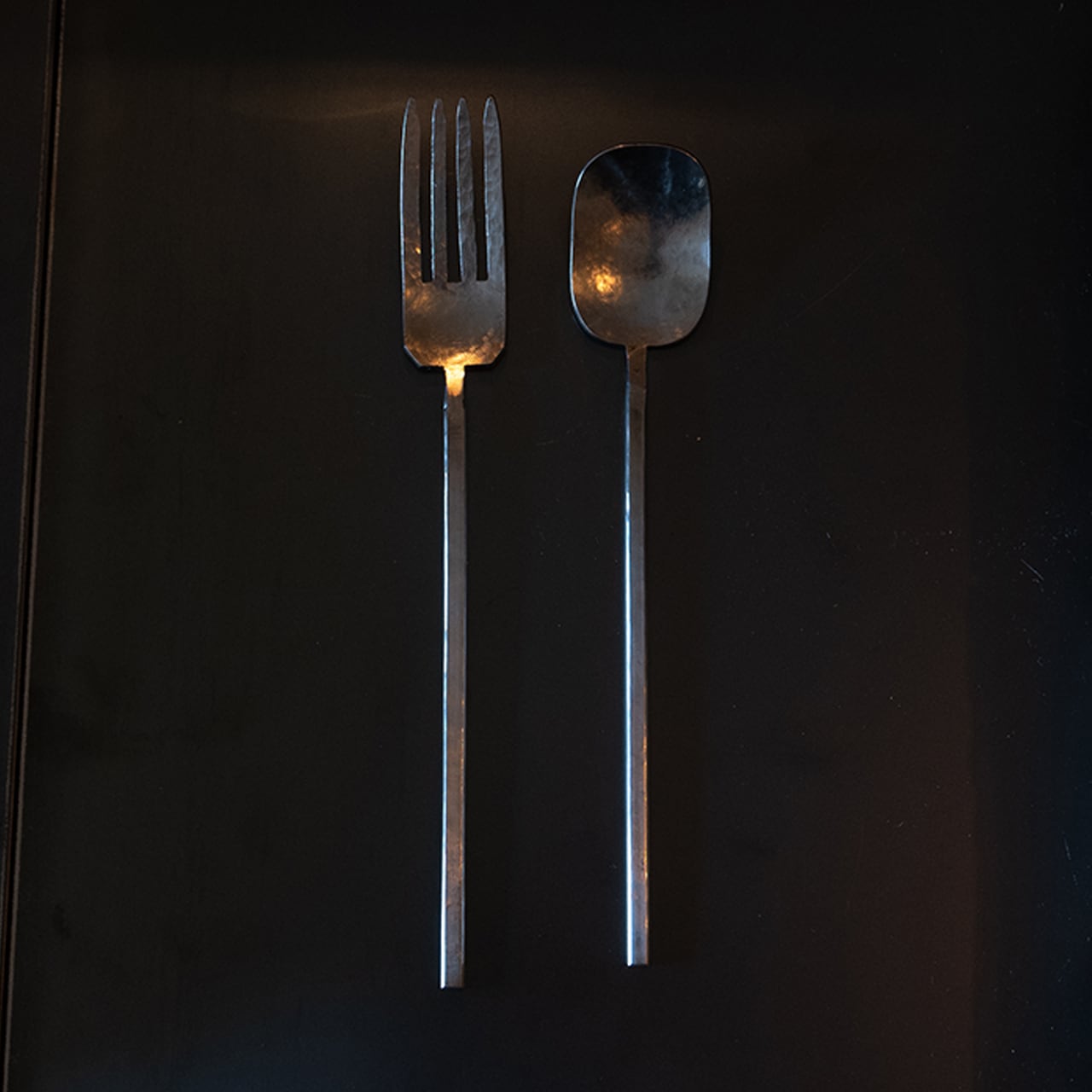 ステンレスの板と棒を叩いて成型(鍛金)することで、曇ったような質感と手になじむ凹凸ができることが特徴のフォーク。パスタやお肉料理などで使用できるサイズ感です。